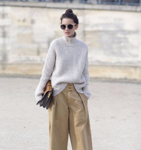 而这个时候你就会发现阔腿裤,对于你的造型穿搭并没有特别大的帮助,所以我们推荐大家在冬天选择宽松的微喇裤,或者是稍微宽松的设计。如果是在北方,通常大家里面会穿一条很厚的打底裤,宽松的设计是穿上打底裤,并且还有稍微宽裕,不会紧紧的裹在腿上为主