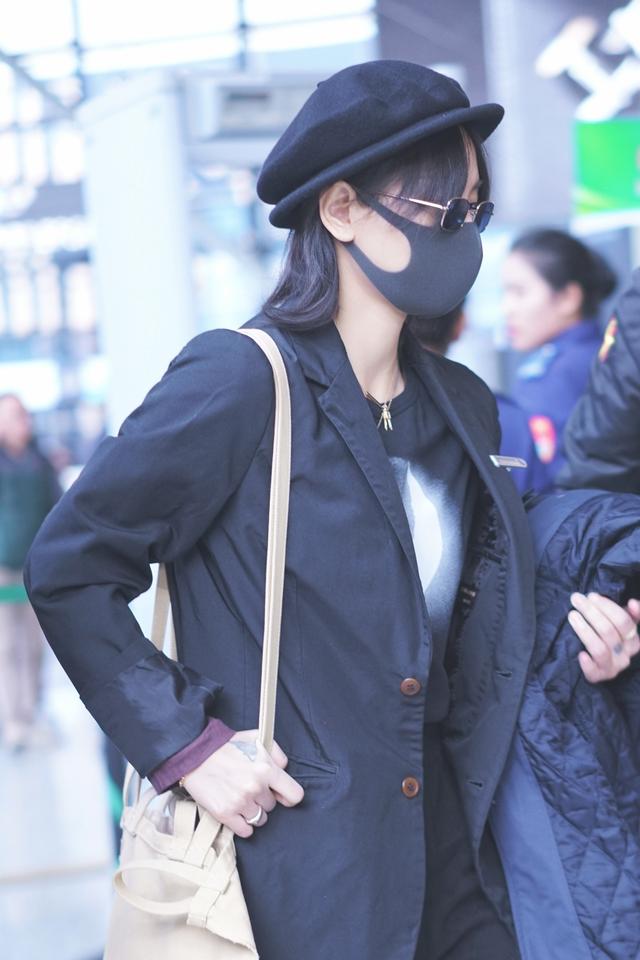 在机场的周笔畅头带着黑色的渔夫帽盖住了自己黑色的短发,在自己的前额处留下了一点刘海,并且将刘海弄成了中分的形式,加上一个黑色的墨镜,看起来很像是一个冷面的杀手一样